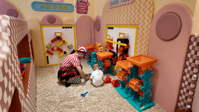 此外,游乐区域都需要配备店员来陪玩和看护。店员告诉有意思报告,她们都需要进行过专业培训,因此薪资会高于其他店员。不过,她们“一天之内,除了吃饭1小时,其余时间都要在乐园里”。